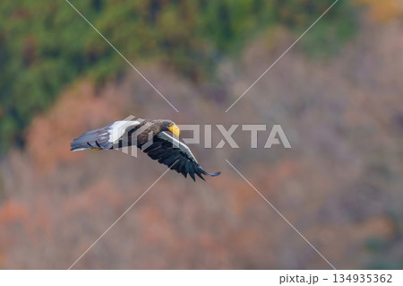 ちょうど見頃の紅葉の山をバックに悠然と飛ぶオオワシ