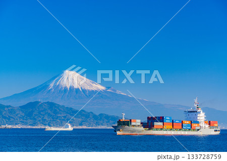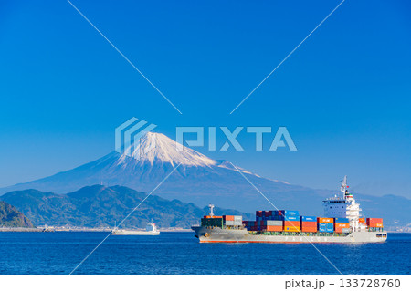【静岡県】富士山を背に、朝日を受けて清水港に入港するコンテナ船