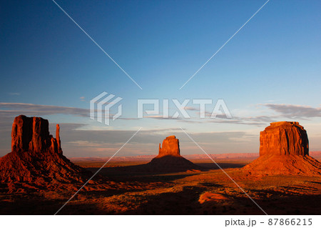 アメリカ・ユタ州アリゾナ州のモニュメントバレーにて早朝の夜明け前のミトンビュート