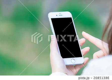 女性 スマホを持った女性の手元 緑背景 グリーン 企業宣伝用画像素材