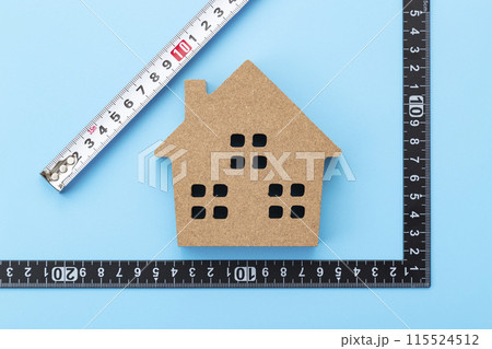 木目背景に曲尺と家のオブジェ