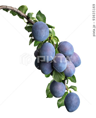fresh purple plum and slices with leaves isolated on white background with clipping path and full depth of field. Set or collection