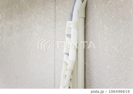 壁から飛び出したエアコンの配管と取付け中の化粧カバー エアコン取り付け工事