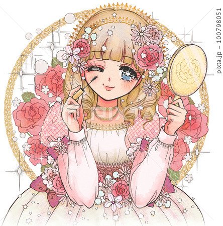 少女まんが風メイク・手鏡とマスカラを持つプリンセス