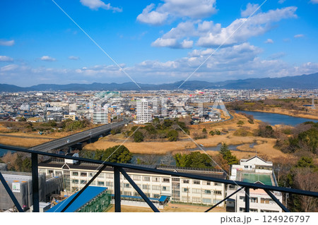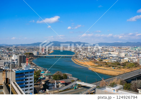 愛知県豊橋市 豊橋市役所、展望ロビーから見る豊川と街並み