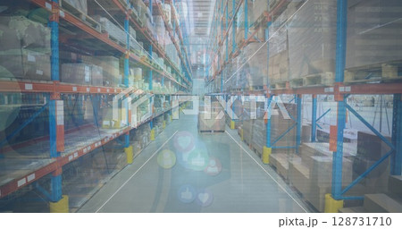 Image of multiple profile icons and statistical data processing against empty warehouse