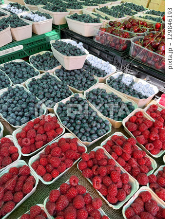 Punnets of ripe raspberries, blueberries, and cherries are neatly arranged on a market stall, creating a vibrant display of colorful fresh produce
