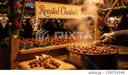 Street Vendor Roasting Chestnuts at Night with Festive Holiday Lights and Steam in Winter Outdoor