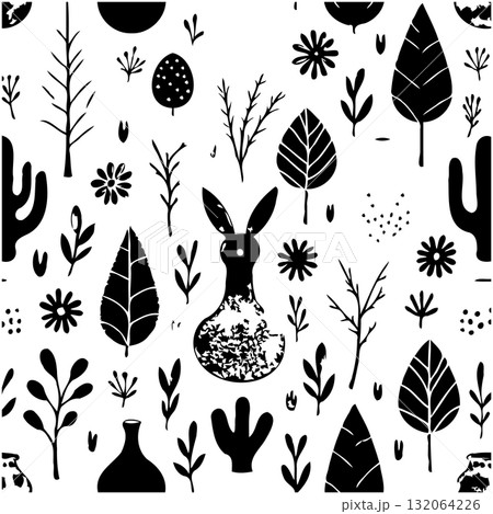 Botanical Line art abstract pattern whit plant and flowers vector illustration. Black and white outline repeating floral print. Graphic design for Wallpaper Cover Wrapping Textile Greeting Card Book