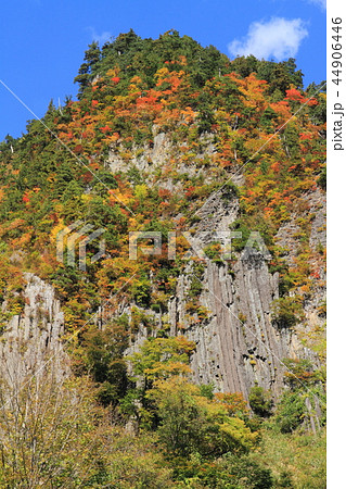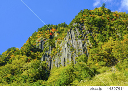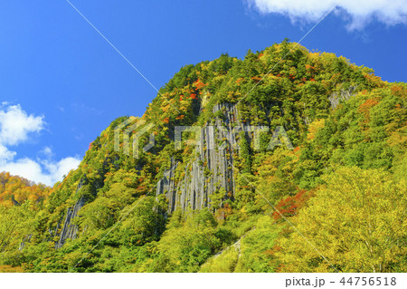 長野県・秋山郷 紅葉に染まる迫力のある柱状節理の岩壁