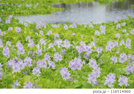公園の池に咲くホテイアオイの薄紫色の花(夏、八月)