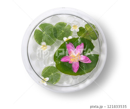 睡蓮と水草のあるガラスのアクアリウム。真上からのアングル