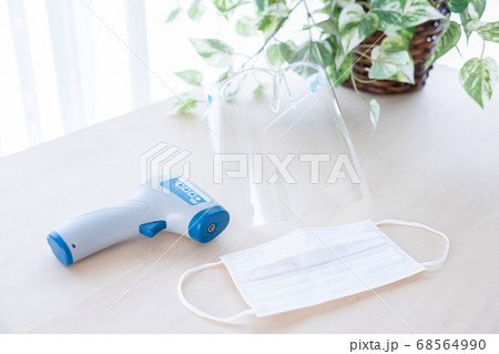 コロナウィルス対策 検温時に使う非接触体温計、フェイスシールド、マスクの物撮り