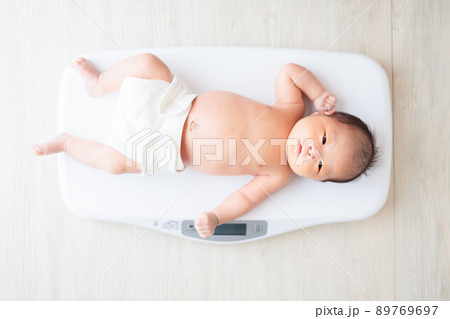 体重を測る肌着姿の赤ちゃん 生後1ヶ月