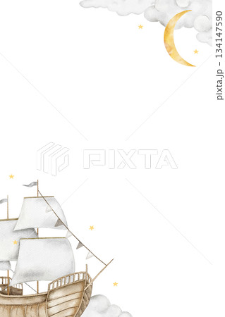 Vertical watercolor rectangular frame with wooden sailboat, white sails, clouds, yellow crescent moon, and small stars. Suitable for baby invitation, nursery poster, or children card design.