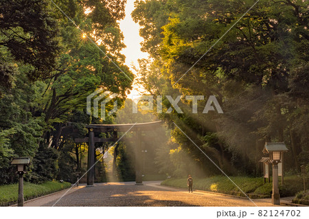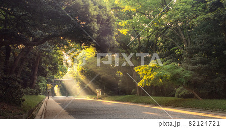 Sunlight shining above Torii gate in Meiji Shrine, Meiji Jingu in Tokyo, Japan