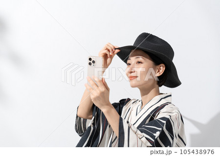 若い女性 浴衣 和服 黒髪 スマホを操作 写真を撮る