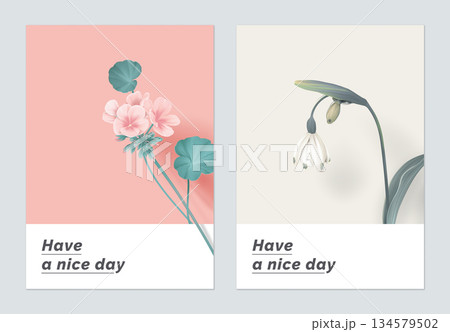 Minimalist botanical greeting card template design, Pelargonium zonale and snowdrop