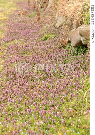 畑の隅を赤紫色の絨毯にしたホトケノザの花