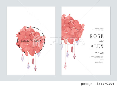 Floral wedding invitation card template design, red Pelargonium zonale flowers decorated with crystals