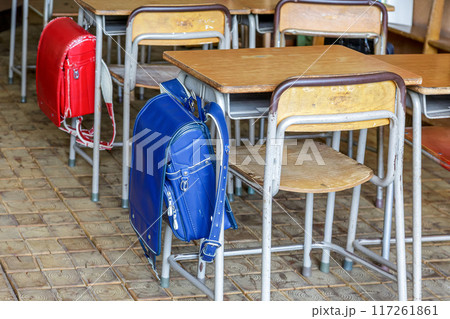 レトロな机に黒のランドセルが古い教室【ノスタルジー】