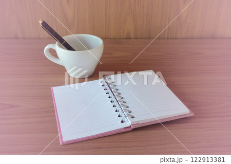 Still life,open notebook with blank pages next to cup of coffee on wooden table.