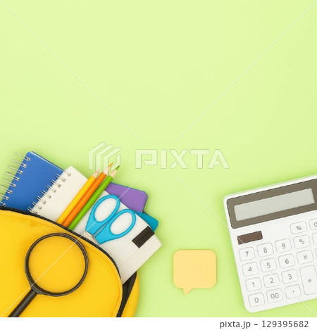 School supplies on green background. notebooks, colored pencils, scissors, calculator, sticky notes, Back to school concept.