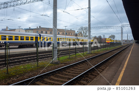 Yellow-blue suburban train at the railway station in Riga.