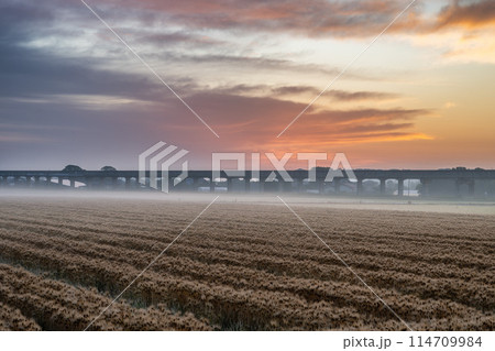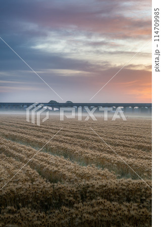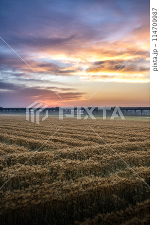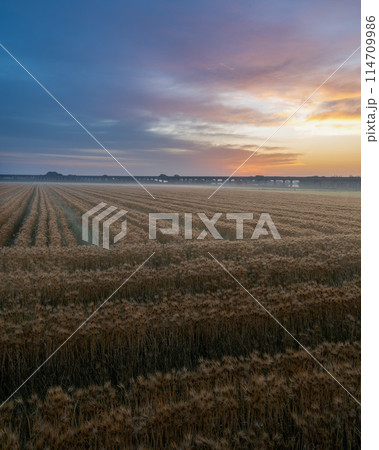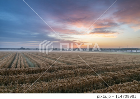 茨城県ひたちなか市 朝陽に照らされる小麦畑