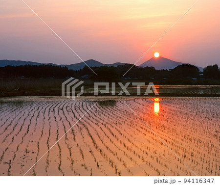 ロマンチック茨城(水田に映る夕焼けが、やけに赤く見える。幼い頃の思い出がよみがえる。)石岡市、筑波山