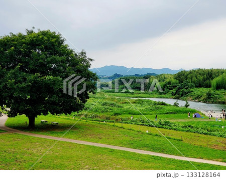 大木、山、川、のどかな田舎の風景