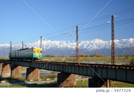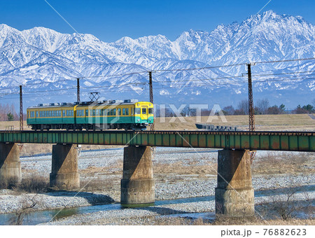 春の北アルプスをバックに常願寺川鉄橋を渡る黄色い電車 富山地方鉄道の風景