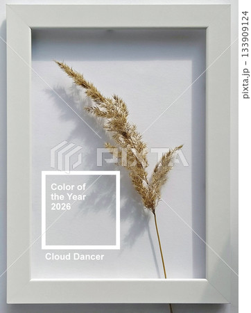 White frame with dried pampas grass on neutral white background, Color of the Year 2026 Cloud Dancer, minimal modern composition