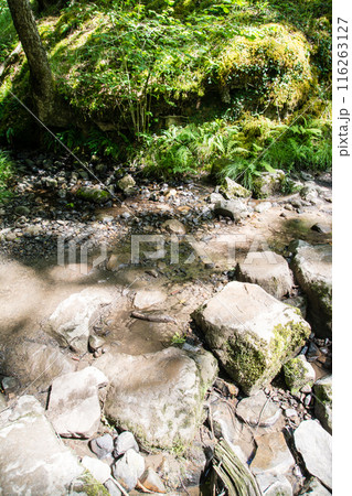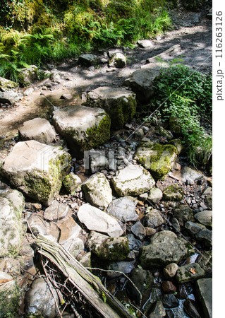 干上がった小川にクロスする飛び石で作った橋 南ウェールズの森の中にて