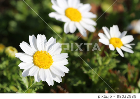 明るい日差しを浴びて咲いている三輪のローマンカモミールのアップ