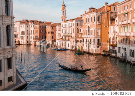 Tranquil shot of the Grand Canal in Venice, Italy, with gondolas gliding along the water. Serene atmosphere and beautiful architecture captured in this peaceful image.