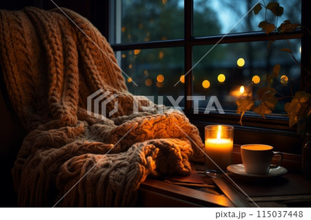 A cozy blanket and a cup resting on a window sill, creating a calm atmosphere in a simple setting