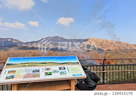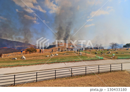 北九州市のカルスト台地平尾台の野焼きと見学する人物