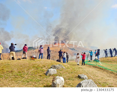 北九州市のカルスト台地平尾台の野焼きと見学する人たち