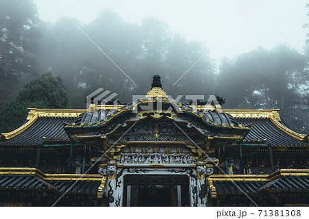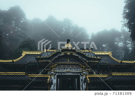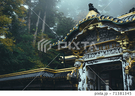 霧に包まれる雨の日の日光東照宮(神輿舎)
