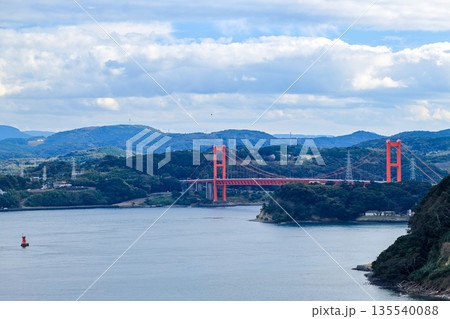 平戸城から眺めた朱塗りの平戸大橋の景色