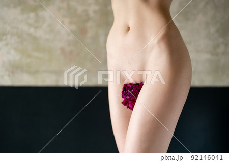Beautiful tender young girl with pink peony flower. Sexy naked woman