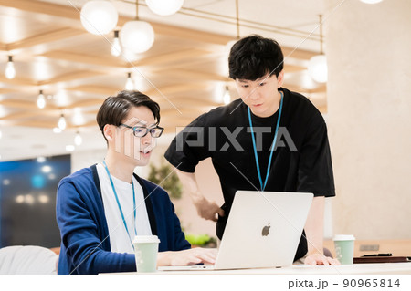 クリエイティブオフィスで働く、年下の上司の指導を受ける年下社員