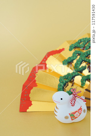 巳年 年賀素材 白巳と飾り扇子 金色バック