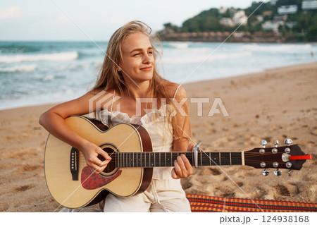 Woman Playing Guitar and Relaxing on the Beach at Sunset