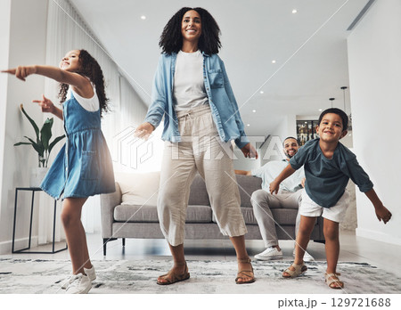 Happy family, fun and dance in a living room by mother and children playing, bonding and happy in their home. Kids, parents and dancing game in a lounge on a weekend, cheerful and happiness together
