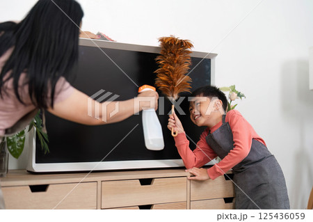 Home Cleaning and Family Bonding. A child helping his mother clean the living room with a duster and vacuum.