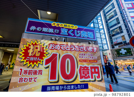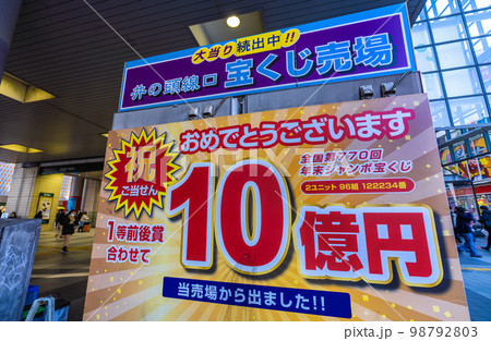 日本の東京都市景観 井の頭線口の宝くじ売場。祝、10億円…(売場の裏側に)=2月1日