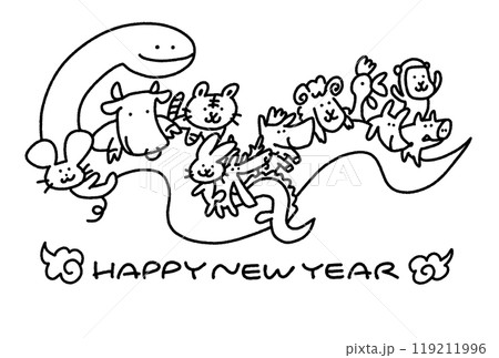 蛇に乗る可愛い干支の年賀状 十二支 2025 線画 モノクロ