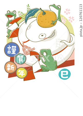 年賀状 デザイン ヘビに鏡餅のコスプレをさせるカエル 2025年 巳年 年賀状用テンプレート